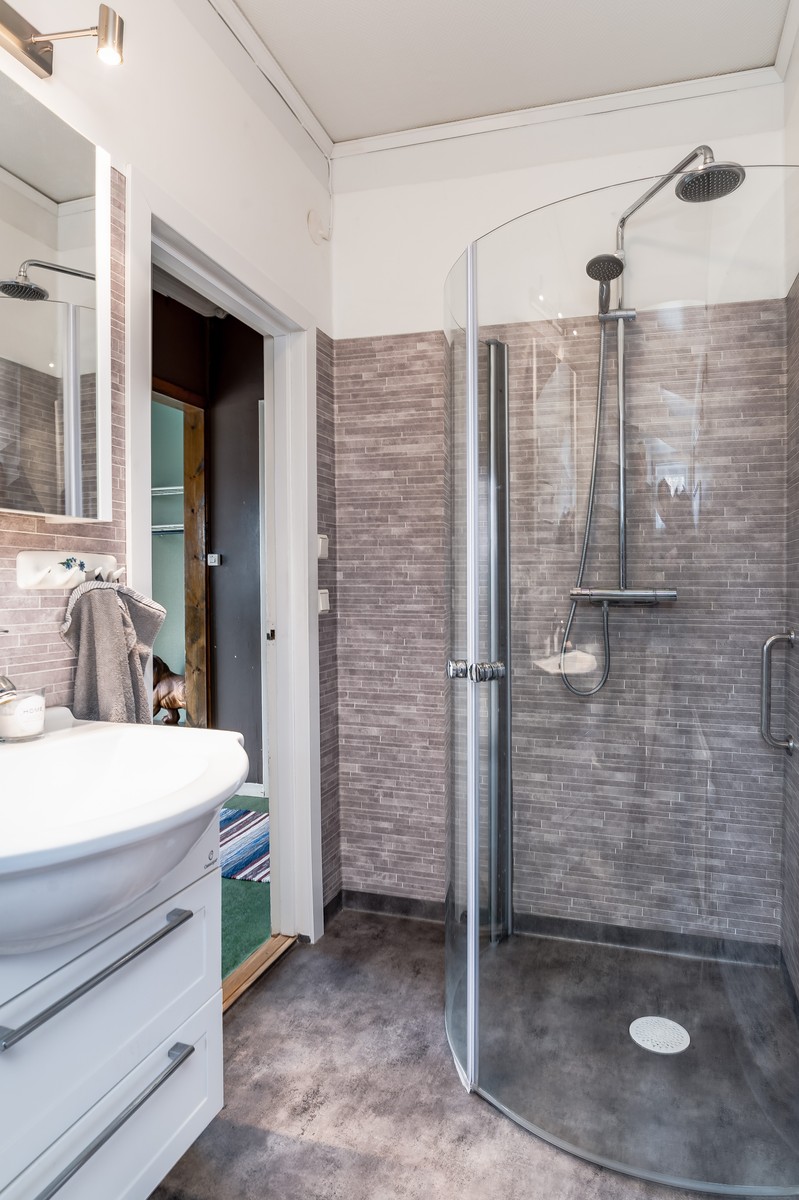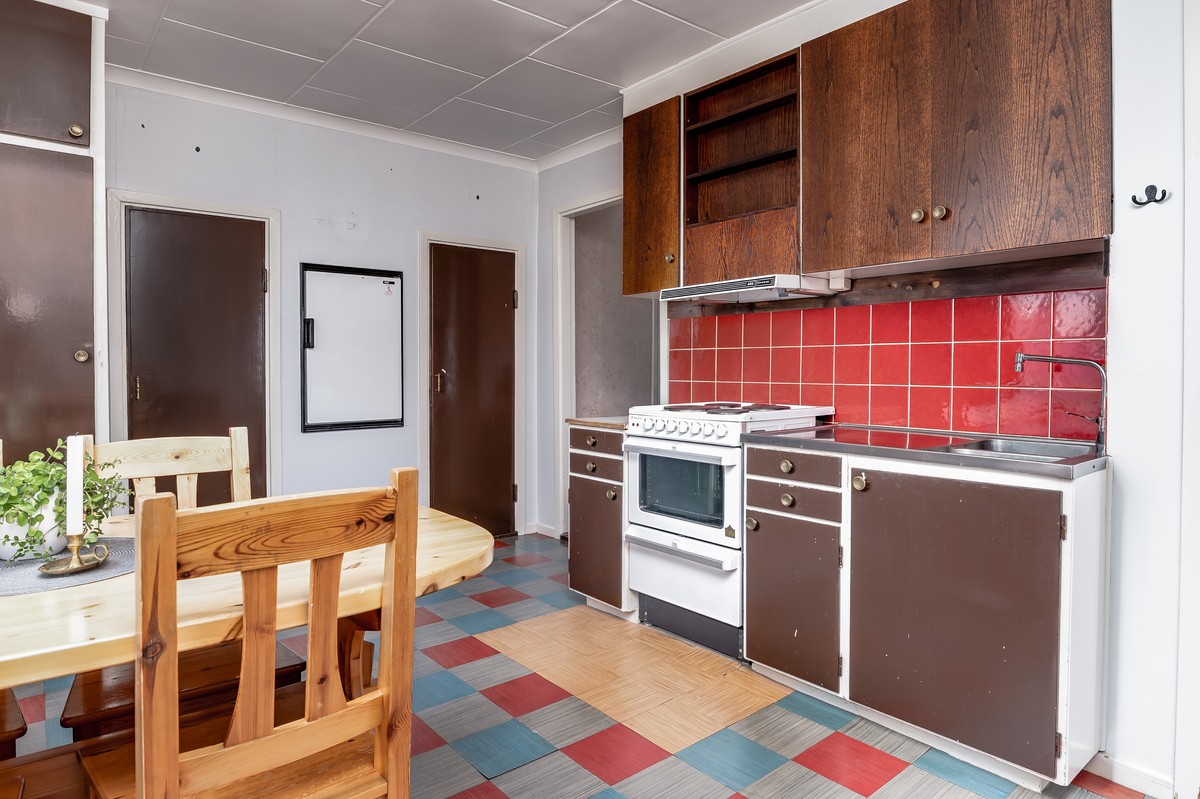 Hall mot kök och badrum. Trappa till övervåning. Plastmatta och tapet. Badrum renoverat 2016. Utrustat med: duschväggar, tvättställ, toalett och toppmatad tvättmaskin. Våtrumsmatta och våtrumstapet. Kök med matplats för 4-6 personer. Här finns möjlighet att öppna upp en vägg mot matrum för att få större utrymme. Utrustat med spis och hel kyl och frys samt skafferi. Plastmatta och tapet. Allrum med kamin (2021) Rummet vetter mot två sovrum och större vardagsrum. Plastmatta och tapet. Sovrum med garderober. Plastmatta, tapet och trätak. Sovrum med garderober. Plastmatta och tapet. Stort vardagsrum med plastmatta och tapet. Övervåning: Möbler bar hall med större klädkammare. Laminatgolv och tapet. Kök övervåning (kan givetvis göras om till allrum eller sovrum). Utrustat med spis, fläkt och kombinerat kyl/frysskåp och fläkt. Plastmatta och tapet. Sovrum med katt vind. Plastmatta och tapet Gårdshus med stor loge. Här finns även varmbonat gästrum.